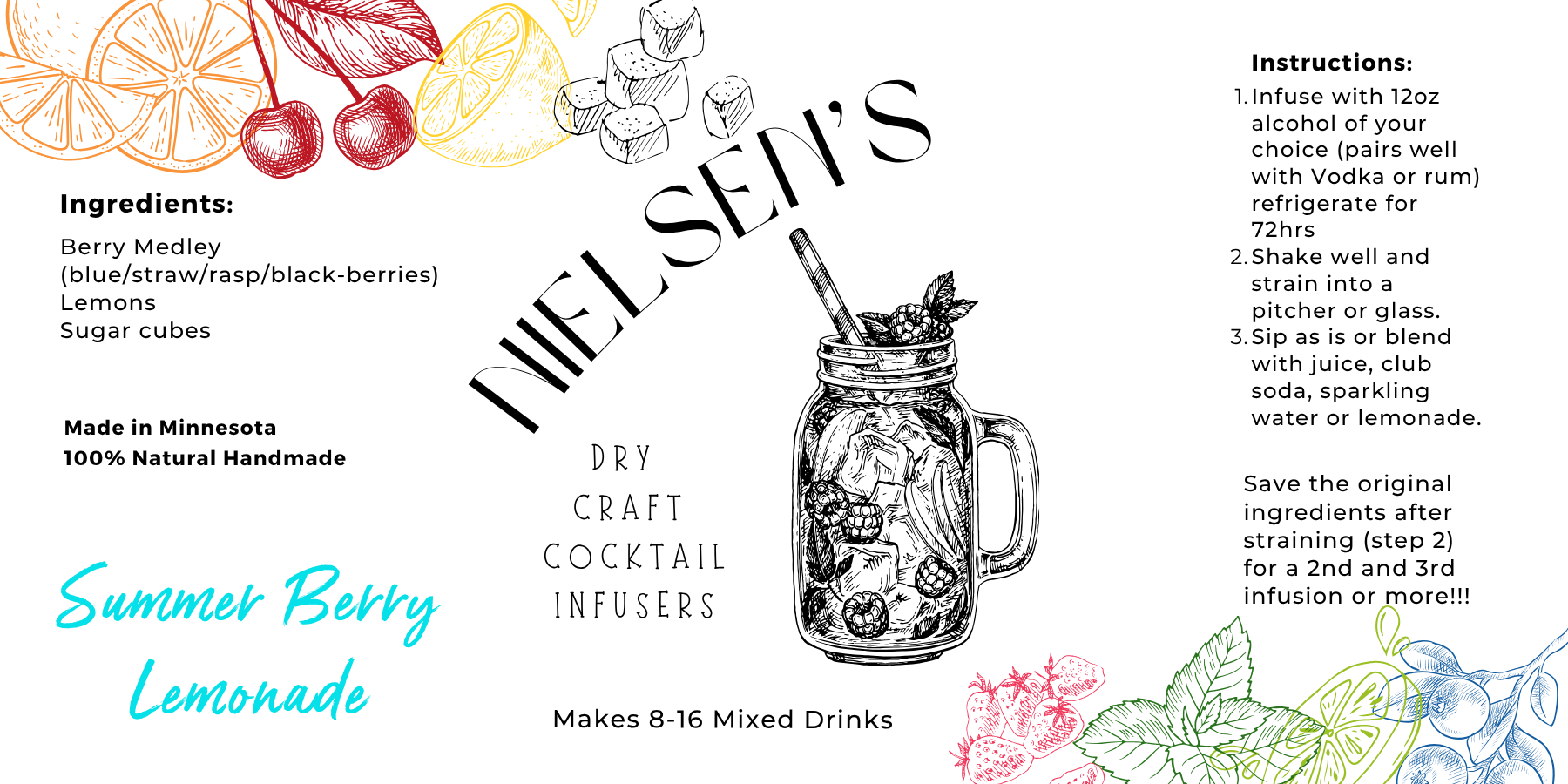 Juicy, sweet, and refreshingly tart - our Summer Berry Lemonade Dry Craft Infuser brings sunshine to your glass. Handcrafter in Minnesota using a medley of berries, fresh lemons, and sugar cubes, this all-natural cocktail base is the perfect mix of warm days and cool drinks. Just add vodka or rum, chill, and enjoy a sip of summer.